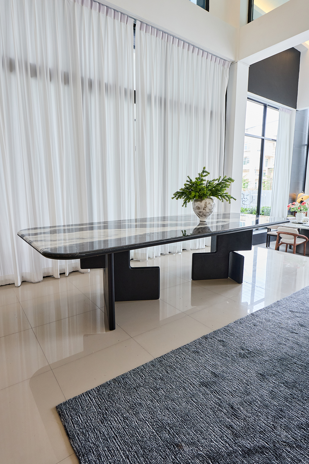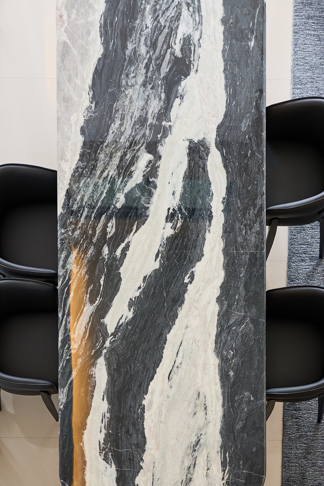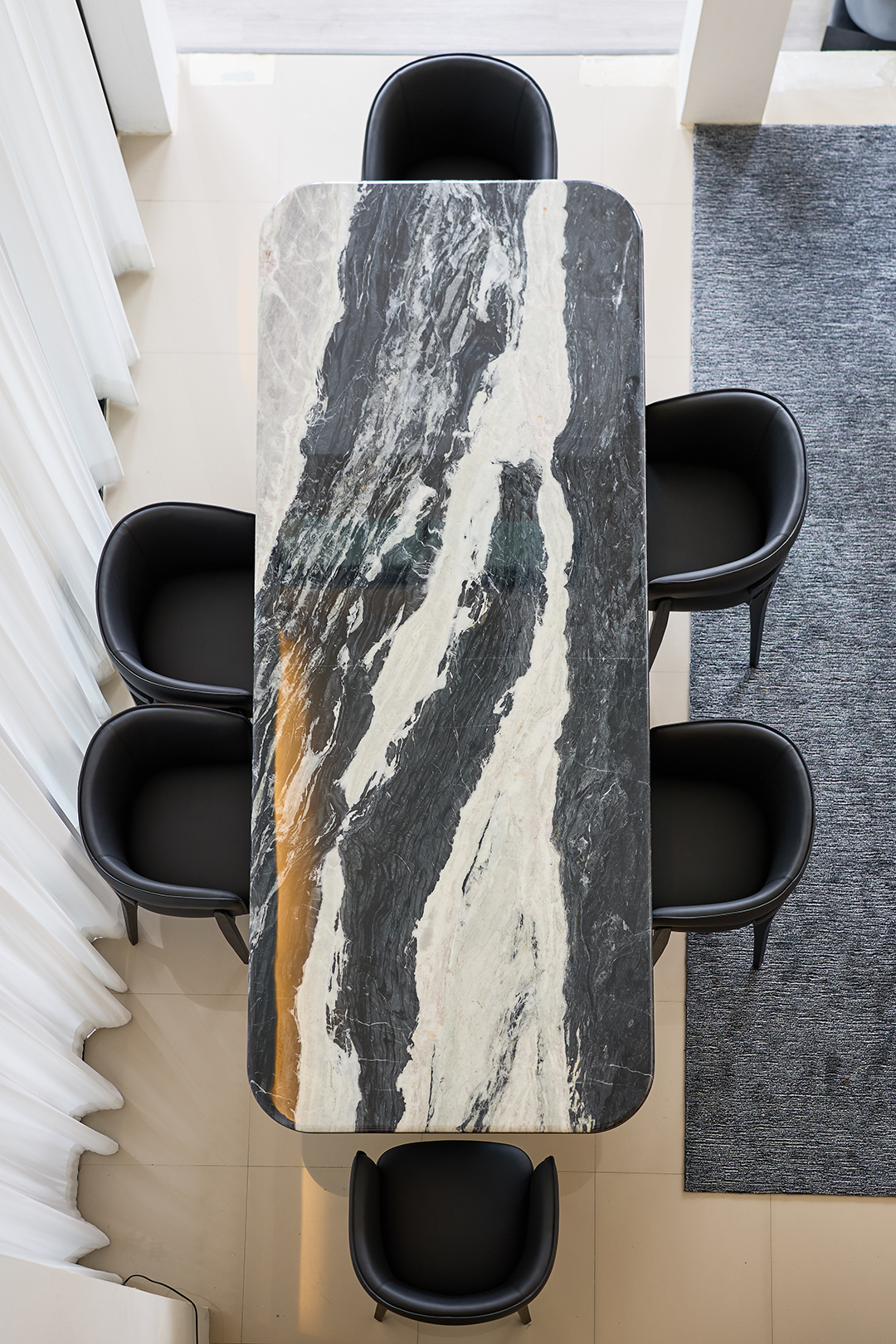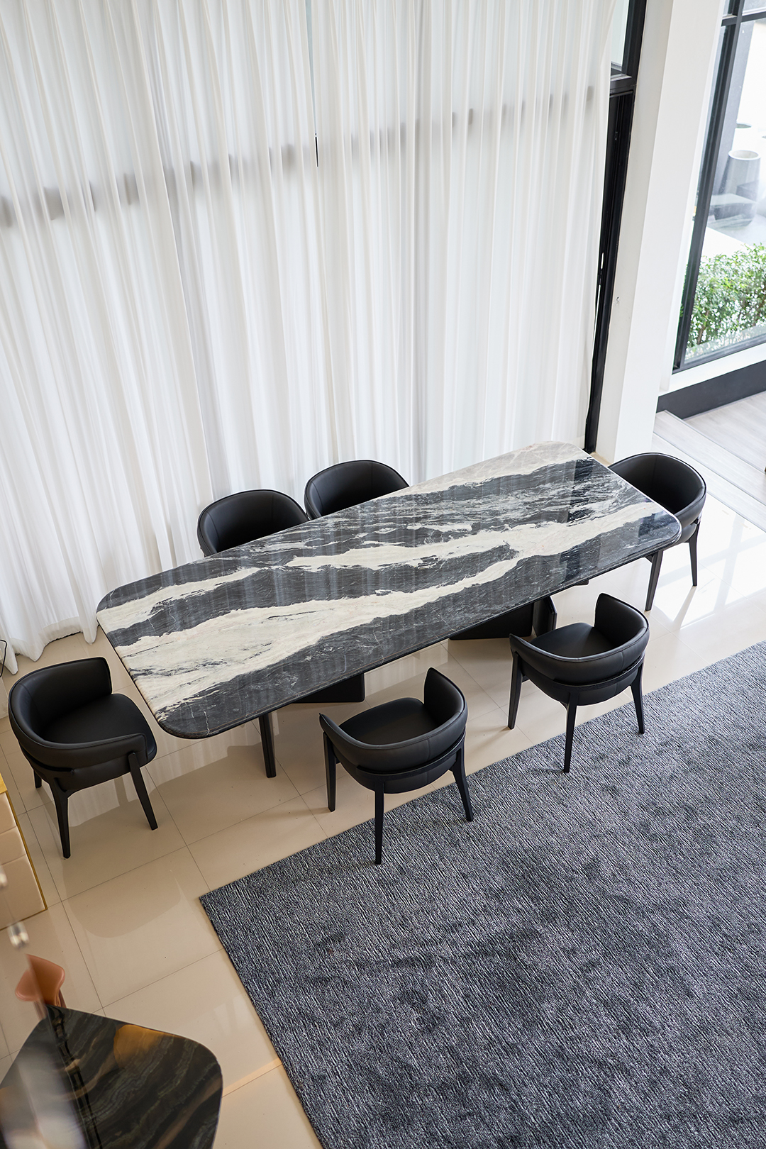 FEATURES * Modern Design * Premium Zebra Marble Top Paired with Luxury Dining Chairs