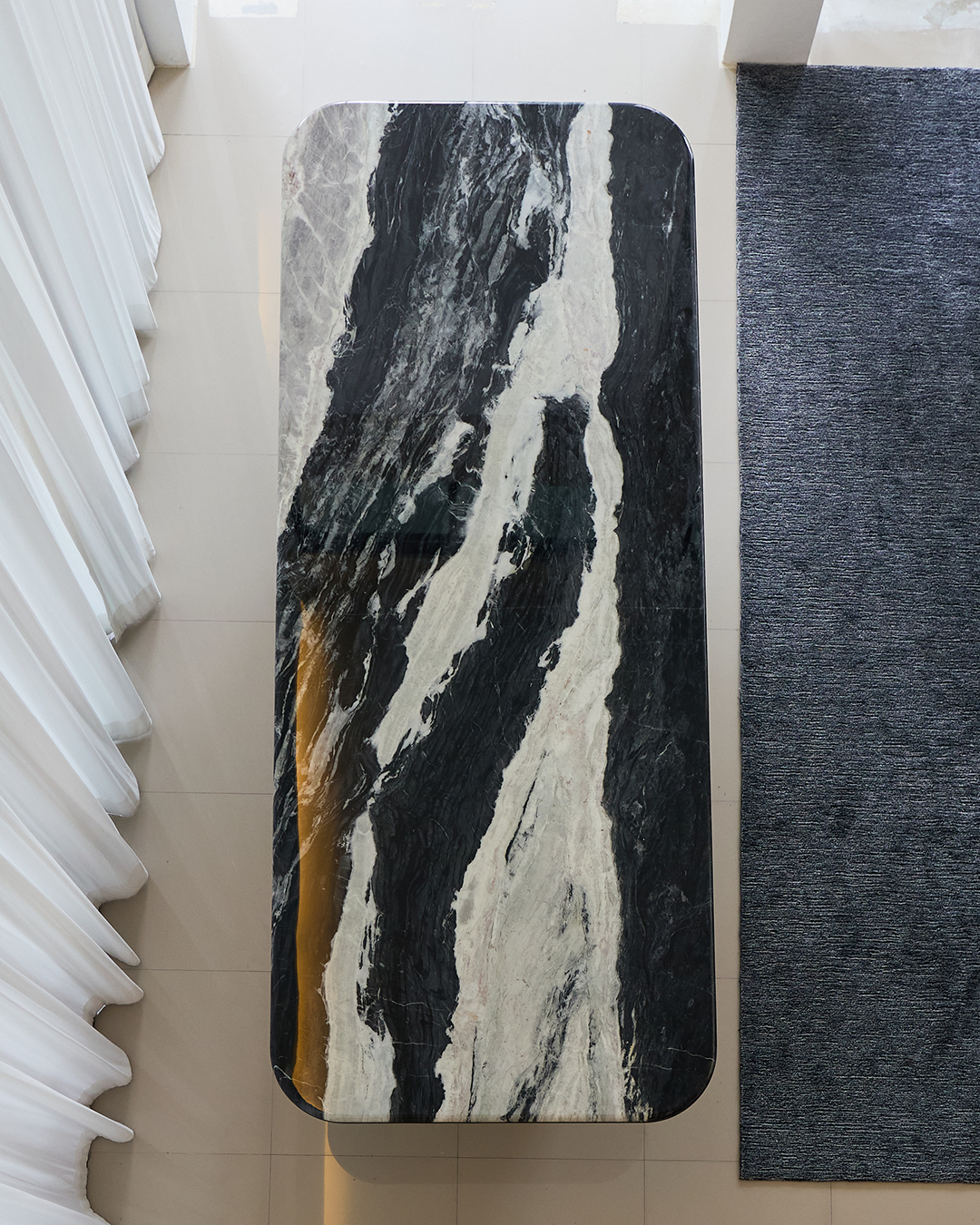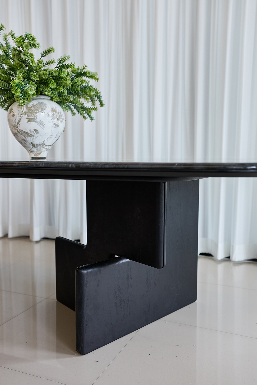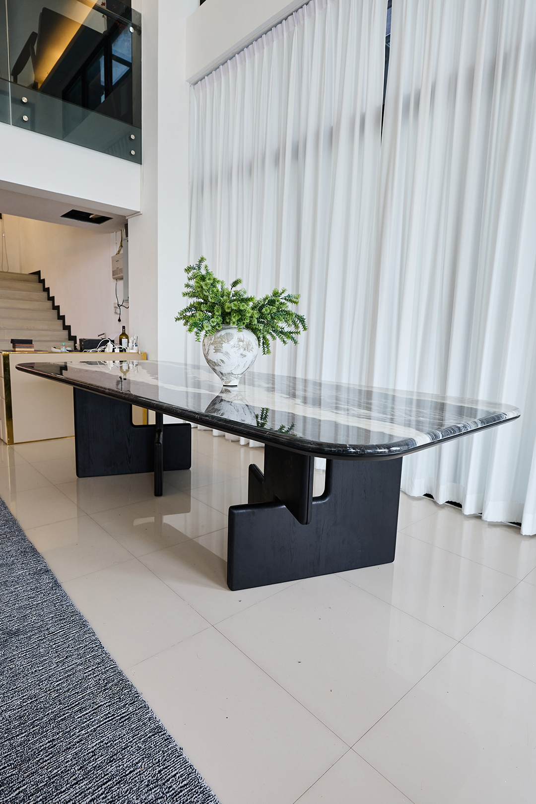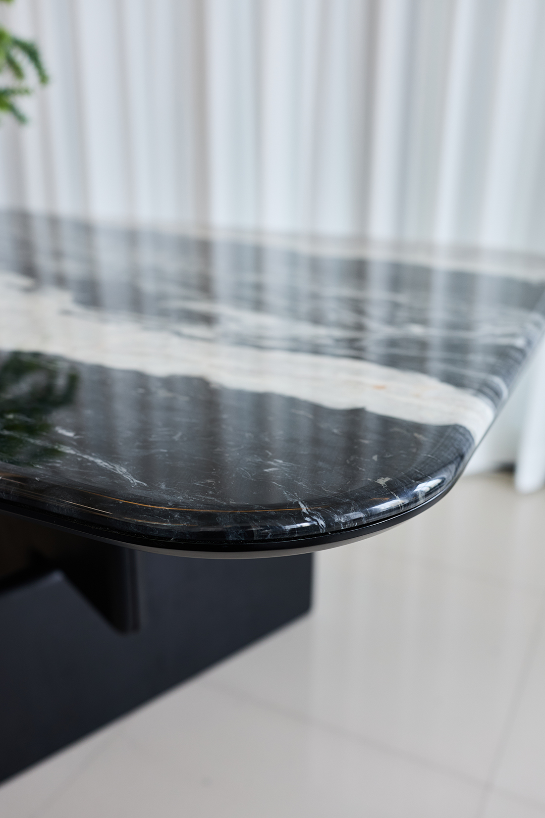 FEATURES * Modern Design * Premium Zebra Marble Top Paired with Luxury Dining Chairs